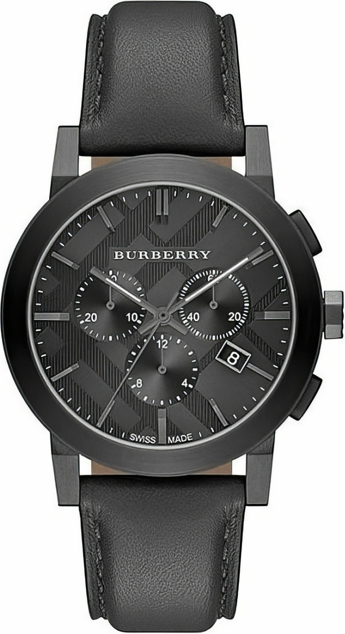 Cette élégante montre pour homme de la collection Burberry The City est dotée d'un bracelet en cuir noir et d'un cadran rond.