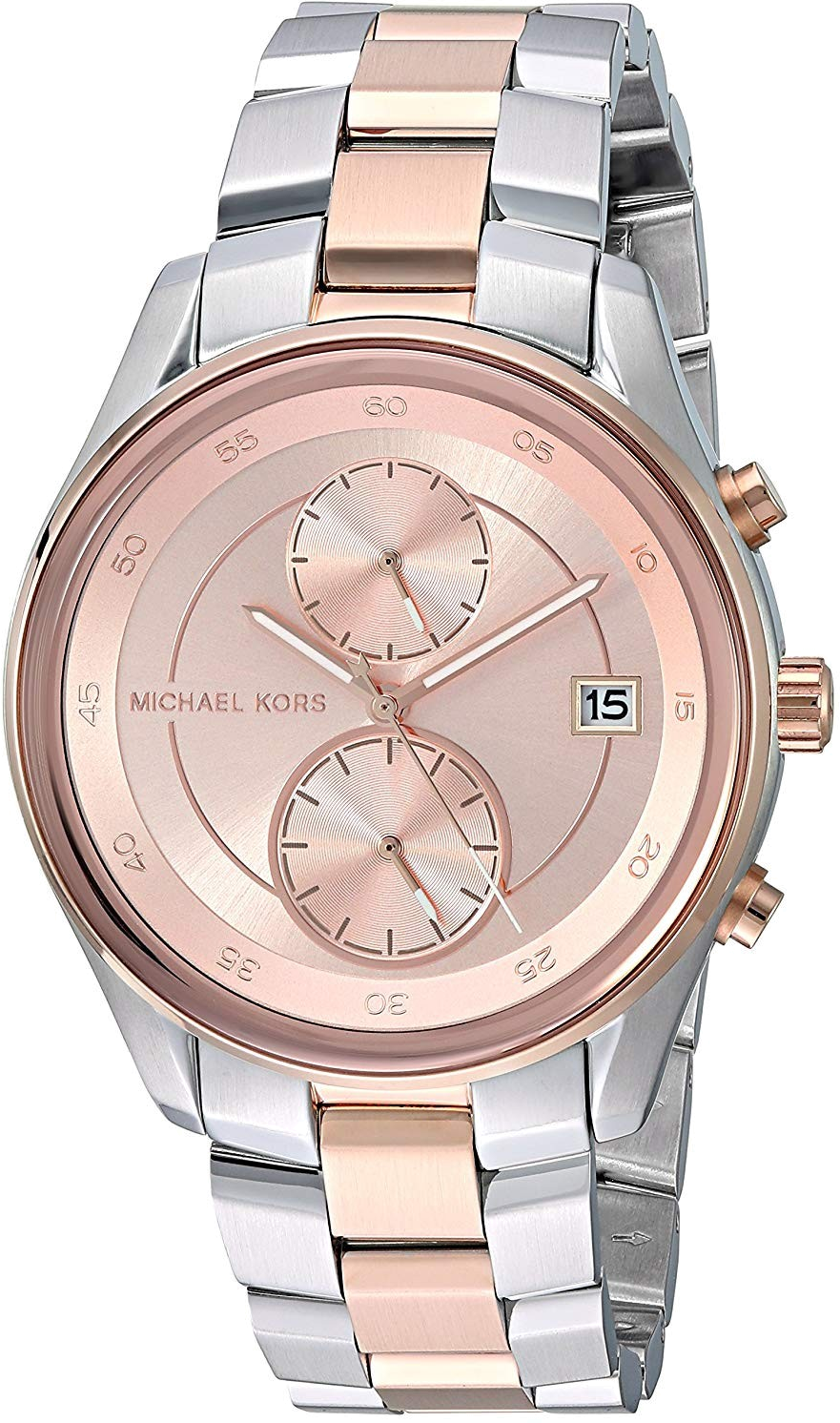 La montre Michael Kors MK6498 se distingue par son savoir-faire horloger et son design élégant. Elle intègre un boîtier en acier inoxydable de 39 mm de diamètre, qui abrite un cadran rose. Le mouvement à quartz assure une précision optimale et sa fonction chronographe permet de mesurer le temps avec aisance. Le verre minéral qui protège le cadran est choisi pour sa résistance aux rayures, garantissant une bonne durabilité au quotidien. Le bracelet en acier inoxydable, mesurant 18 mm de large, est accompagné d'une boucle déployante pour un maintien sécurisé.
